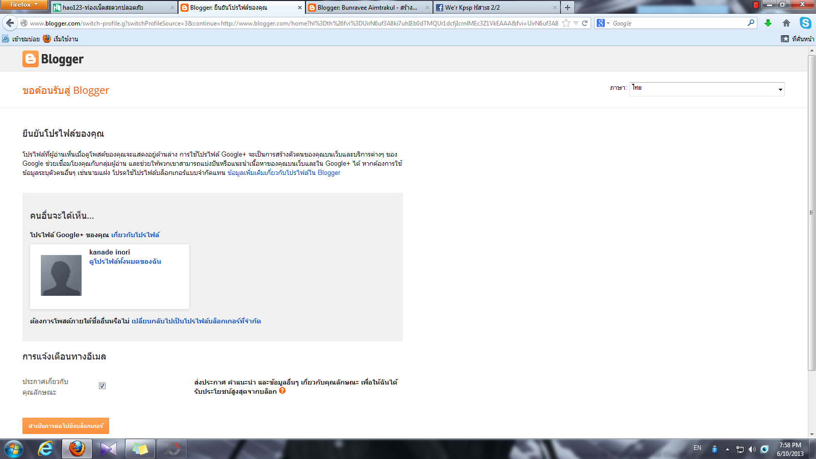 5. พอกด "ลงชื่อเข้าใช้งาน" แล้วจะมาถึงหน้านี้ ซึ่งจะเป็นหน้าที่ให้กดยืนยันการเข้าใช้งาน Blogger ให้กด "ดำเนินการต่อไปถึงบล็อกเกอร์"